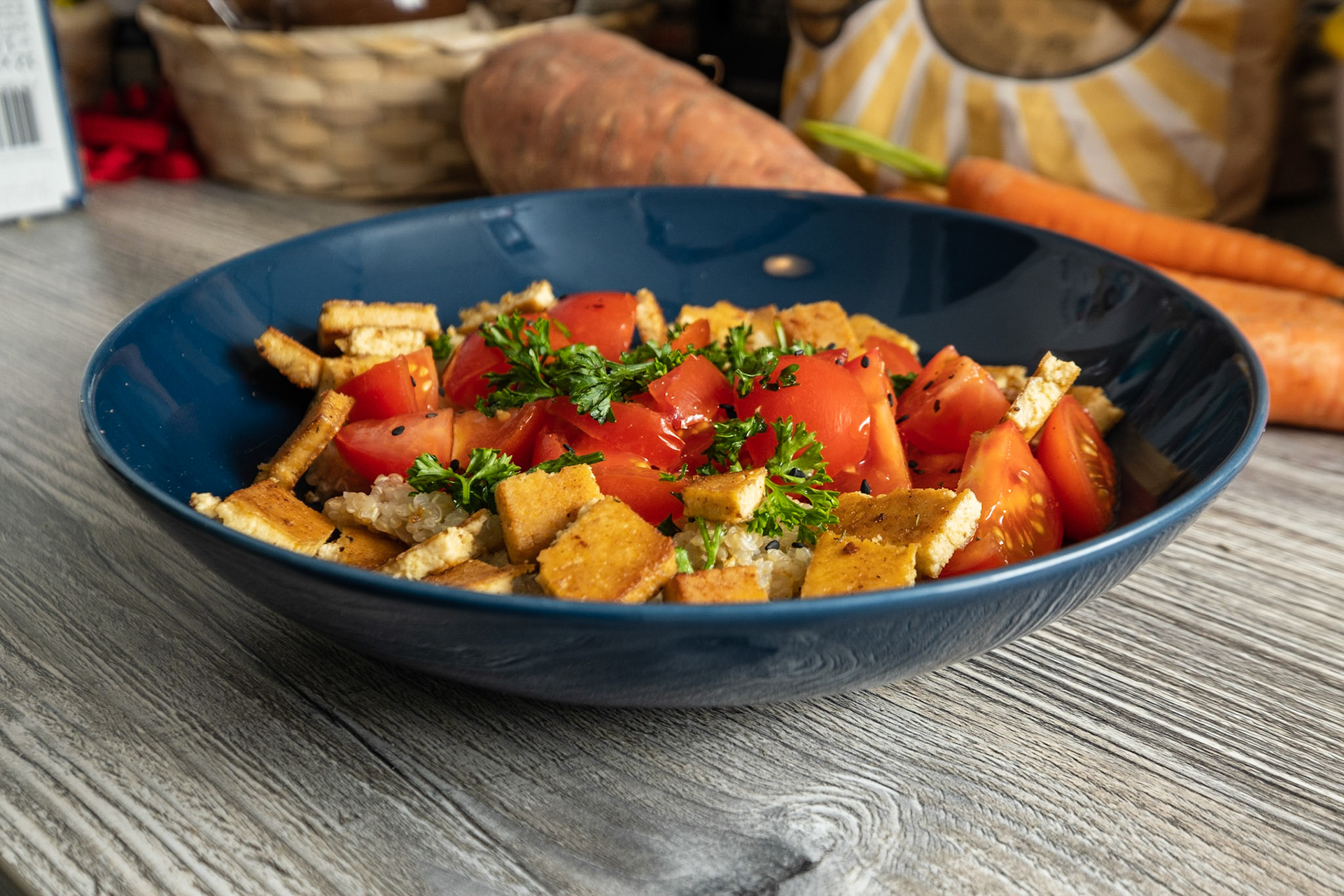 Croquetas de quinoa con ensalada de tomate y espinaca